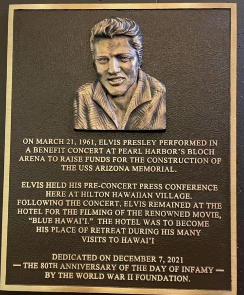Op 25 maart 1961 trad Elvis Presley op tijdens een benefietconcert in Pearl Harbor's Bloch Arena om geld in te zamelen voor de bouw van het USS Arizona Memorial. Elvis hield zijn pre-concert persconferentie in het Hilton Hawaiian Village. Na het concert bleef Elvis ook in het hotel tijdens de opnames van de film 'Blue Hawaii'. Het hotel zou zijn toevluchtsoord worden tijdens zijn vele bezoeken aan Hawaii. Opgedragen op 7 december 2021 – de 80e verjaardag van de Dag van Infamy – door de World War II Foundation.” De plaquette, met bovenaan een bronzen buste van Elvis, werd onthuld door de World War II Foundation en zal te zien zijn naast de Hilton Hawaiian Village Tapa Tower. Tim Gray, voorzitter van de World War II Foundation, zei dat de Elvis-plaquette was gekozen om te worden getoond in het Hilton Hawaiian Village omdat "Elvis daar altijd verbleef als hij in Oahu was. Voorafgaand aan zijn concert hield hij daar zijn persconferentie. We weten dat het elk jaar door tienduizenden mensen zal worden gezien die het hotel bezoeken en misschien zal dat hen inspireren om meer te willen weten over Elvis' rol in het project." De reizigers die al ingeschreven hebben voor de Hawaii-reis kunnen deze prachtige plaquette in het echt aanschouwen.