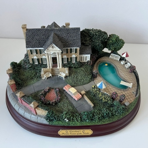 Eén van de blikvangers is de zeldzame Hawthorne Village “Elvis Presley’s Graceland – Private Corner of the World” uit 2002. Deze rijk gedetailleerde miniatuur toont Elvis’ iconische woning in Memphis, compleet met zwembad, terras en sfeervolle verlichting. Elk exemplaar is handgeschilderd, genummerd en voorzien van een goudkleurig naamplaatje. Het huis en zwembad kunnen worden verlicht voor een warme, sfeervolle presentatie – een waar pronkstuk voor elke Elvis-collectie.