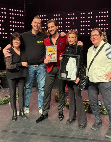 Op de foto zien we Bouke op het podium waar hij later die avond zijn kerstconcert zou geven, met in zijn handen het allereerste exemplaar van het boek. Direct naast hem staat auteur Erik van den Berg, zichtbaar trots op dit bijzondere moment. Ook op het podium staan Ria Reijenga, Astrid van Ommen en Cocky Vader, drie vrouwen wier persoonlijke Elvis-verhalen een prominente plek hebben gekregen in het boek. Zij zagen Elvis Presley in de jaren zeventig live optreden in de Verenigde Staten en deelden hun herinneringen speciaal voor deze uitgave.
